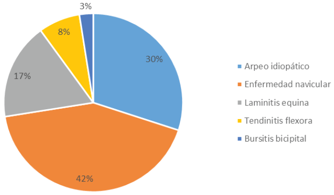 En la FIG. 5 se describen los diagnósticos realizados de las afecciones sistema músculo esquelético, siendo la principal alteración la enfermedad navicular (42%), seguida del arpeo idiopático (30%) y la laminitis (17%).