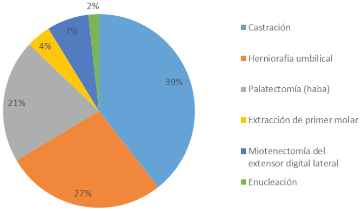 En la FIG. 6 se describen las principales cirugías realizadas, siendo la castración la de mayor frecuencia (39%), seguida de la herniorafia umbilical (27%) y la palatectomia (21%).