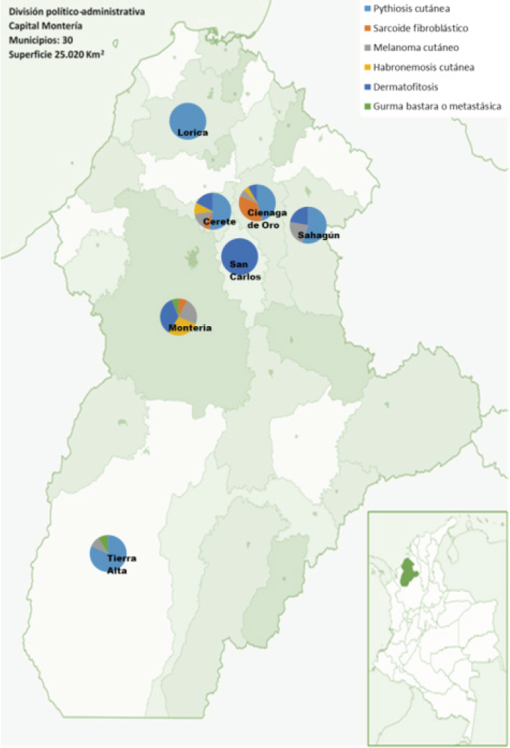 En el FIG. 7 se realizó la distribución de las alteraciones del sistema tegumentario en cada Municipio, se observa una gran incidencia de dermatofitosis (tiña) y Pythiosis en la gran mayoría de los Municipios en los que se reportaron alteraciones dermatológicas, adicionalmente se presenta en la mayoría de Municipios una alta presencia de alteraciones neoplásicas (sarcoide y melanoma).