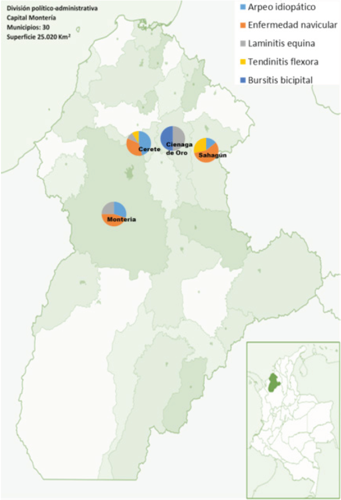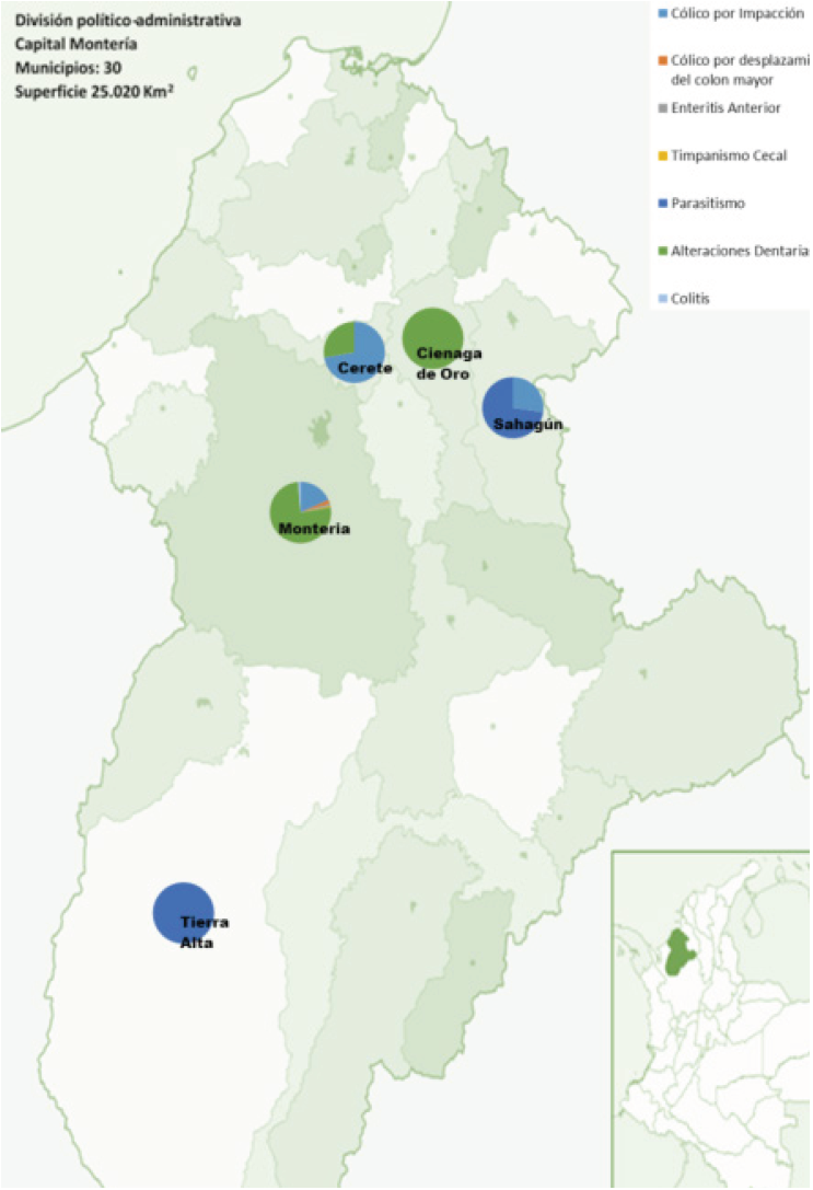 El departamento de Córdoba cuenta con una población de 106.829 equinos [20], los cuales como en muchas otras partes de Colombia y otros países en vía de desarrollo, aún son una herramienta de trabajo para muchas personas de escasos recursos [12], siendo importante para su buen desempeño y bienestar la verificación de las alteraciones que se puedan generar en ellos para su prevención, control y tratamiento [12, 17]. Esto se logra mediante la recolección de datos epidemiológicos que permitan estudiar los factores involucrados en la presentación de una enfermedad, la definición de su causalidad, la determinación de su naturaleza, los factores de riesgo y el establecimiento de acciones destinados a su prevención y control [21], por lo que la descripción de casos atendidos en los centros veterinarios es importante al ser una fuente de información primaria para la instauración de medidas epidemiológicas y de prevención basadas en evidencia científica verídica [19].
