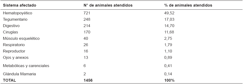 En la TABLA I se resume y discrimina por sistemas, los casos clínicos que han sido atendidos en la especie equina por el servicio ambulatorio de grandes especies, entre los años 2005 y 2016; durante este periodo se realizaron 6.356 consultas de las cuales 1.456 (22,91%) correspondieron a la especie equina, siendo el sistema más afectado el hematopoyético con 49,52% (721 casos) de la casuística, seguido del sistema tegumentario con el 17,03% (248 casos), el sistema digestivo con el 14,7% (214 casos) y los procedimientos quirúrgicos generales 11,68% (170 casos), los demás sistemas presentaron una casuística inferior al 3%.