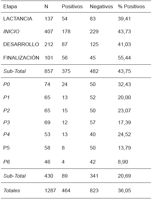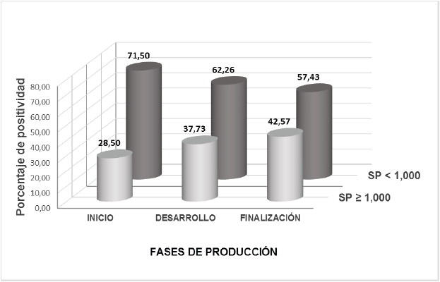 La positividad en los lechones fue de 39,41; 43,73; 41,03 y 55,44% para los grupos de Lactancia, Inicio, Desarrollo y Finalización, respectivamente. Cabe destacar la alta positividad en el grupo de lechones de finalización en comparación con las otras dos fases de producción, principalmente con la etapa de Inicio. No solamente el grupo de lechones de Finalización mostró la mayor positividad a la infección del virus de PRRS, sino que, adicionalmente, fue el grupo que concentró la mayor proporción de individuos con valores de S/P superiores a 1.000, registrando una proporción de 42,57% (FIG. 1). La alta positividad en la fase de Finalización está acorde a lo reportado por otros investigadores quienes obtuvieron tasas de 56% [25] a 84,1% [31], sin embargo, Yeager y col. [45] reportaron valores menores de 33% en lechones de esas edades.