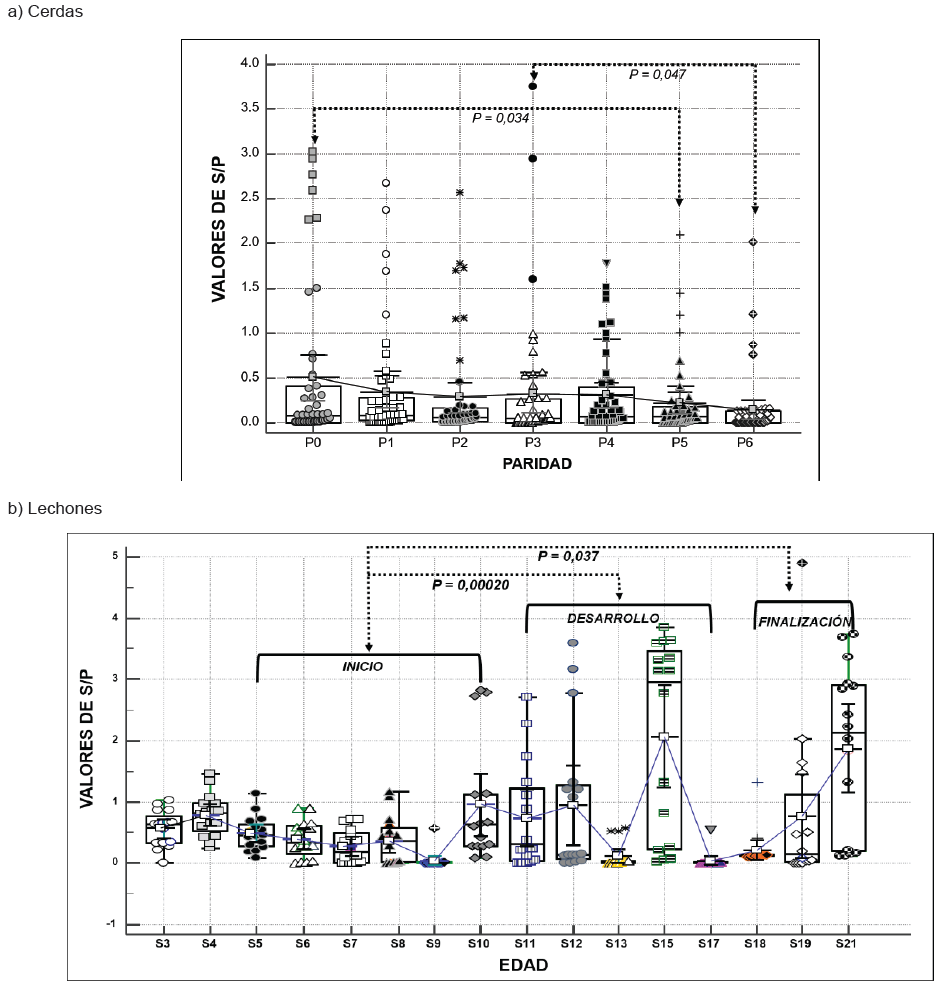 En la FIG. 2 se muestra la cinética de los valores S/P a lo largo de las diferentes paridades y edades. La prueba de Anova verificó las diferencias altamente significativas entre las diversas paridades (P= 0,0085). El valor promedio de S/P más alto se obtuvo en el grupo de cerdas P0 (0,525 ± 0,800) con rangos de 0,000 a 3,022, mientras que los valores más bajos fueron para P6. Se detectaron diferencias entre esta paridad P0 y la paridad P5 y entre P3 y P5 (FIG. 2a). Los rangos de S/P en el grupo P0 o de cerdas primerizas fue algo diferente a los reportado por Tummaruk and Tantilertcharoen [39] quienes obtuvieron rangos de entre 0,428 a 3,673. Dewey y Rajic [9], reportaron los valores más altos de S/P en cerdas de primer parto, y los títulos más bajos en la paridad dos, aunque no encontraron diferencias significativas como las reportadas en el presente trabajo.
