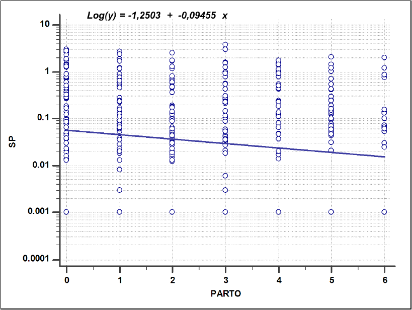 Un análisis de Correlación R de Pearson fue realizado entre la edad o paridad y los valores de S/P como variable dependiente, asumiendo que estos últimos siguen una distribución Gaussiana. Adicionalmente, se efectuó una prueba de Regresión (R2) a objeto de evaluar el grado de asociación o independencia de los valores S/P con respecto a la paridad o edad.