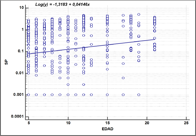 En cuanto a la cinética de la respuesta inmunitaria en el grupo de lechones (FIG. 2b), se puede observar el comportamiento de los valores S/P, en los que se pudo obtener diferencias altamente significativas entre las diversas edades estudiadas (P= 0,11E-007). Cuando se analizaron los valores S/P entre las distintas fases de producción, el análisis estadístico mostró diferencias estadísticas entre la Fase de Inicio versus Desarrollo y Finalización (P= 0,00020 y P= 0,037, respectivamente), no así entre la fase de Desarrollo y la de Finalización (P= 0,495). Como en el caso del grupo de cerdas, el valor de Correlación fue también bajo (r= 0,1651, P= 0,0000084) aunque con alta significancia. Igualmente, el resultado de la prueba de regresión mostró un valor de R2 bajo (0,02726) pero a un nivel altamente significativo (P= 0,0000084) y con pendiente positiva (FIG. 4).