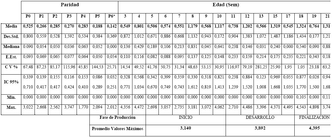 En la TABLA II se encuentran los resultados de estadística descriptiva obtenidos de los valores de S/P agrupados según paridad y edad. La fase de Finalización mostró una frecuencia alta de valores de S/P mayores a 1,0 con respecto al resto de las fases de producción (42,57 versus 28,50 y 37,73% en las fases de Inicio y Desarrollo). Al revisar los promedios de valores máximos de S/P por fase de producción (TABLA II), se obtuvo un valor de 4,395 para los lechones en Finalización, en comparación a los obtenidos en la fase de Inicio y Desarrollo cuyos valores promedios máximos fueron de 3,140 y 3,892, respectivamente. Estos últimos resultados soportan la hipótesis del estado de recirculación o reinfección en la fase de Finalización que se señaló anteriormente.