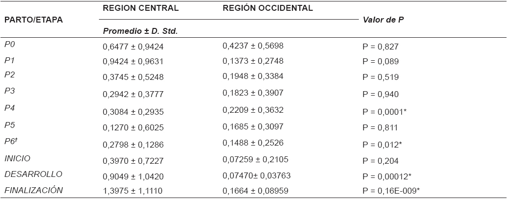 Al analizar el comportamiento de los valores S/P de acuerdo a la región, se obtuvieron diferencias estadísticas entre las paridades P4 y P6 del grupo de cerdas (TABLA III), mientras que esas diferencias fueron altamente significativas en los cerdos de la fase de Desarrollo y Finalización entre ambas regiones. Tummaruk y col. [40] pudieron detectar diferencias en la prevalencia de PRRS en diversas regiones de Tailandia, concluyendo que la localización influyó en la prevalencia de las regiones estudiadas.