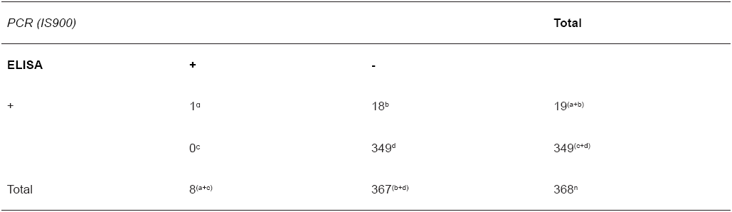 De 368 muestras analizadas por la ELISA, 349 resultaron negativas a la técnica así como también a nPCR y de 19 muestras positivas por ELISA, sólo una de ellas resultó positiva a nPCR. La prueba ELISA presentó una sensibilidad y una especificidad del 100 y 94,6, respectivamente (TABLA II). La concordancia entre las distintas técnicas fue considerada muy baja (0,091); cabe señalar que cada método detecta animales en diferente etapa de la infección [8].