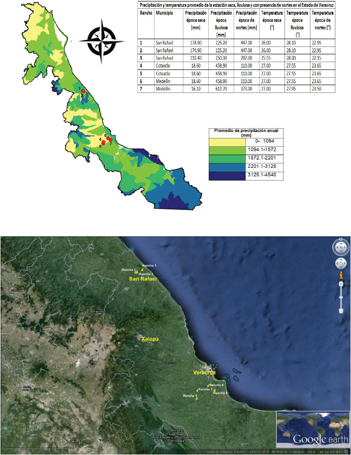 El estudio se realizó durante el año 2013 en siete UP de los municipios de San Rafael, Medellín y Cotaxtla, ubicados en la zona centro del estado de Veracruz, México. El municipio de San Rafael se encuentra ubicado en los límites de la zona centro del Estado y a inicios de la zona norte en las coordenadas: paralelos 20° 08´ y 20° 18´ de LN; meridianos 96° 46´ y 97° 02´ de LO; altitud entre 10 y 100 msnm. Su clima es cálido húmedo con abundantes lluvias en verano (98%) y cálido subhúmedo con lluvias en verano (2%), con un rango de temperatura de 24-26 °C y un rango de precipitación de 1400-1600 mm [8]. El municipio de Medellín se localiza en la zona centro del Estado, en las llanuras del sotavento, en las coordenadas: paralelos 18° 50´ y 19° 09´ de LN; los meridianos 96° 02´ y 96° 16' de LO, altitud 5 y 60 msnm. Su clima es cálido subhúmedo con lluvias en verano, de mayor humedad (69%) y cálido subhúmedo con lluvias en verano, de humedad media (31%), con un rango de temperatura de 24-28 °C y una precipitación de 1100-1600 mm [8]. El municipio de Cotaxtla se encuentra ubicado en las llanuras del sotavento, en la zona centro costera del Estado y en los límites de la zona sur. Su clima es cálido subhúmedo con lluvias en verano, de humedad media (31%) con un rango de temperatura de 24-28 °C y una precipitación de 1100 mm. Sus coordenadas: entre los paralelos 18° 44´ y 18° 59´ LN; los meridianos 96° 11´ y 96° 32´ de LO; altitud 10 y 200 m. Su clima es cálido subhúmedo con lluvias en verano (100%; FIG. 1), con un rango de temperatura de 24-26 °C y una precipitación de 1100-1300 mm [8].