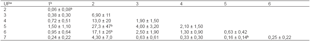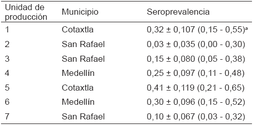 En la TABLA I se presentan las SP de neosporosis y sus intervalos de confianza al 95% por UP. Dichas SP fueron desde 3% (UP 2) hasta 41% (UP 5), con una SP promedio de 22,3%. Ninguno de los intervalos de confianza incluyó el cero, por lo que las SPs de neosporosis de las siete UP ubicadas en la zona centro del estado de Veracruz fueron realmente mayores que cero.