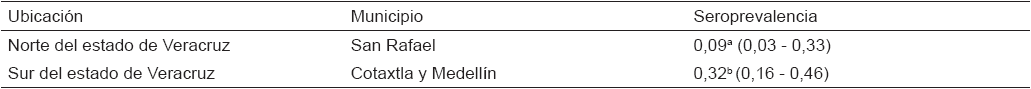 Los resultados obtenidos en el presente trabajo muestran que la neosporosis se encuentra presente en todas las UP de los tres Municipios muestreados en la zona centro del estado de Veracruz. El factor de riesgo estudiado indicó que el ganado de las UP ubicadas al sur, municipios de Medellín y Cotaxtla, tienen 5,9 veces más probabilidad de ser seropositivo a N. caninum (P<0,01) que el de las UP ubicadas al norte de la zona centro de Veracruz, municipio de San Rafael (TABLA II). En otras palabras, debido a que la SP de N. caninum fue casi 6 veces mayor en los municipios de Medellín y Cotaxtla que en el de San Rafael, se pudo confirmar que las UP ubicadas al sur, tienen un peor estatus zoosanitario, que posiblemente es debido a un menor control en la realización de pruebas para diagnosticar animales positivos a N. caninum, antes de adquirirlos e introducirlos a sus hatos, así como un nulo control de fauna doméstica, feral o silvestre en sus instalaciones.