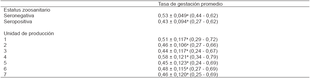 En contraste con lo sucedido en el análisis de la SP de neosporosis, los factores de riesgo estatus zoosanitario de la vaca y UP no afectaron (P>0,05) la TG (TABLA IV). Por un lado, esto significa que las vacas seropositivas a neosporosis tuvieron una TG similar a la de las vacas seronegativas, a pesar de observarse una tendencia de mayor TG (10 puntos porcentuales más) en las vacas seronegativas; por otro lado, esto significa que las UP tuvieron TG similares. Es posible que debido a que en estas UP los animales se encuentran en contacto con el agente causal durante ya varios años de exposición, los animales convivan con la enfermedad, y al verse inmunodeprimidos por alguna causa, las pérdidas de la gestación aumenten a más de un 50%. La media general de la TG de las siete UP fue 48,28% (TABLA IV).