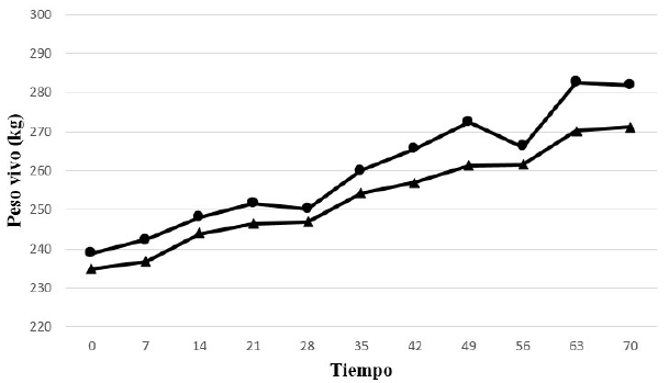 La GDP en el grupo de novillas permitió alcanzar un peso al final del ensayo de 350,4 kg a los 26 meses de edad, y González-Stagnaro y col. [17] sugieren que el peso de monta para novillas mestizas debe estar entre 320 y 340 kg, a la edad de 24 a 28 meses, dependiendo del manejo tecnológico de la finca.
