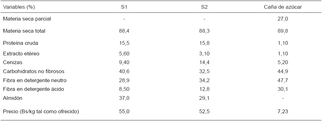 Muestras de S1, S2 y CA fueron tomadas a inicio y mediados del ensayo para su análisis bromatológico según la Association of Official Analytical Chemists (AOAC) [2], MS a 65 y 105ºC con estufa de ventilación forzada (THELCO®, Modelo 6M, EUA), proteína cruda (PC) por método Kjeldahl (N x 6,25), ceniza por ignición, extracto etéreo (EE) por reflujo con éter de petróleo; adicionalmente fibra en detergente ácido [35], FDN en CA [36] y suplementos [19], y solo en estos últimos se determinó almidón a través de hidrólisis ácida [2]. Los carbohidratos no fibrosos fueron calculados según Weiss [38] como: 100 % - (% FDN + % PC + % EE + % Ceniza). Los resultados del análisis químico, así como los precios de los suplementos y CA se muestran en la TABLA I.