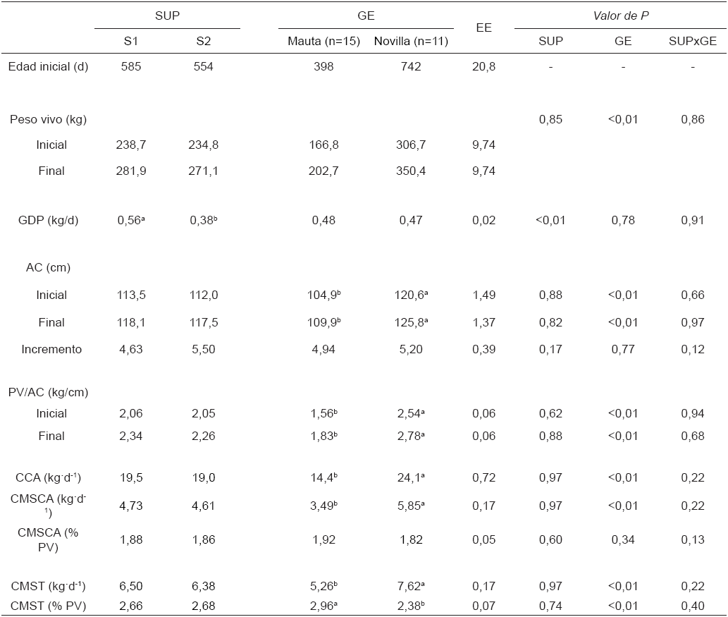 La GDP fue igual entre ambos grupos etarios de animales (P=0,78; TABLA II) con valores de 0,48 y 0,47 kg·animal·d-1, para mautas y novillas, respectivamente, lo que sugiere en este experimento, que para mantener una GDP adecuada (>0,45 kg·animal·d-1) en mautas alimentadas exclusivamente con CA se debió suministrar una cantidad de suplemento (15% PC) equivalente al de una novilla (1,76 kg MS/d) lo que representa en función del PV inicial del experimento el 1 y 0,6% del PV para mautas y novillas, respectivamente.