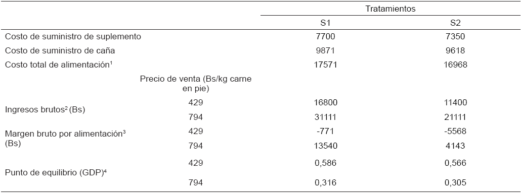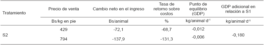 La GDP adicional obtenida por S2 (-0,18 kg·animal·d-1) fue menor a la calculada (TABLA III) para obtener resultados positivos según el punto de equilibrio, donde S2 en virtud de su menor costo sólo podía disminuir su GDP en -0,012 y -0,006 kg·animal·d-1 para precios de venta en pie de 429 y 794 Bs/kg, respectivamente. A medida que el precio de venta en pie se incrementa el punto de equilibrio (GDP) también lo hace, esto indica que a mejores precios de venta, la utilización de alimentos de menor costo (a razón de 2 kg·animal·d-1), que disminuyen el desempeño animal, no son opción adecuada para la suplementación de hembras vacunas mestizas en crecimiento estabuladas.