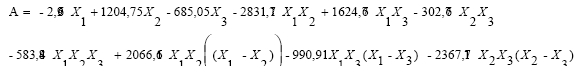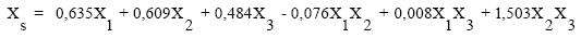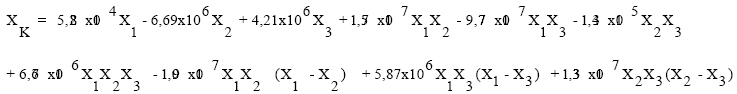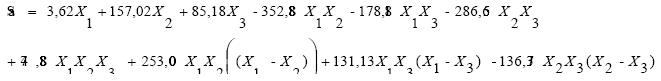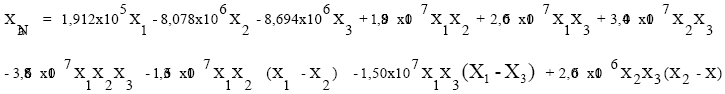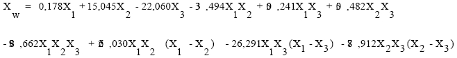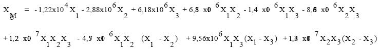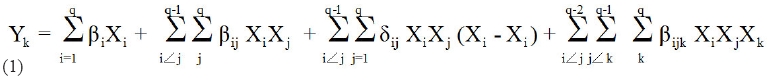 donde Yk representa la respuesta experimental, βi el coeficiente del efecto lineal, βij el coeficiente del efecto cuadrático, δij el coeficiente del efecto de la interacción y βijk el coeficiente del efecto triple, mientras que q es igual al número de los factores ensayados (q = 3).