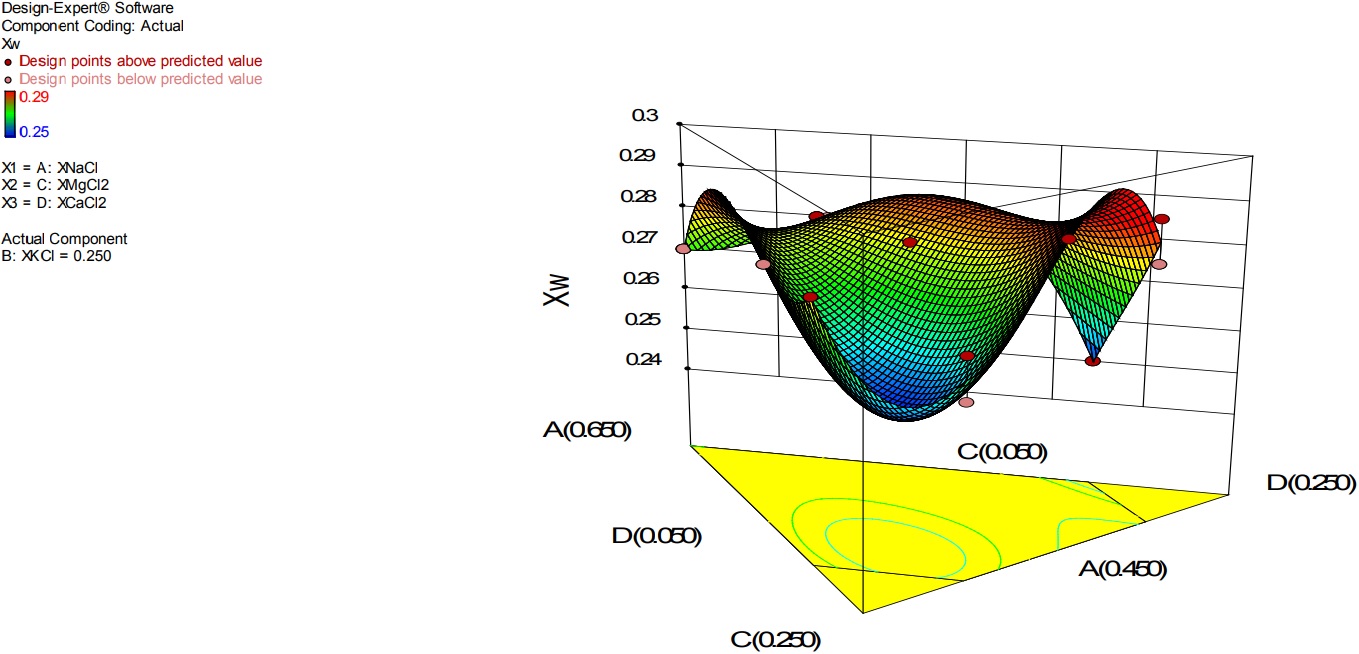 Para visualizar los efectos combinados de cada uno de los componentes de la mezcla en las diferentes variables respuesta, se generaron a partir de los modelos, las superficies de respuesta (FIG. 1) correspondientes, dentro del rango experimental. En la FIG. 1, se puede observar que la superficie de respuesta presenta un punto estacionario con un mínimo valor para Xw, XNa, Xc, Sa y A, una loma ascendente para Xs, XCa, y un punto estacionario con un valor máximo para Tex, XK, XMg . Observando las figuras de contorno se puede analizar el efecto de cada uno de los factores en las diferentes variables respuesta. Por ejemplo, el contenido de humedad (FIG. 2): a) es constante e igual a 0,26 para combinaciones de valores de X1 entre 0,50 y 0,46 g NaCl/g; X2 entre 0,13 y 0,20 g MgCl2/g; y X3 entre 0,07 y 0,12 g CaCl2/g; b) disminuye cuando X3 se incrementa desde 0,05 hasta 0,07 g CaCl2/g, aumenta cuando se incrementa desde 0,12 hasta 0,19 g MgCl2/g, y disminuye cuando de aumenta hasta 0,20 g MgCl2/g; c) disminuye cuando decrece X1 desde 0,61 hasta 0,050 g NaCl/g, pero aumenta cuando X1 se disminuye hasta 0,45 g NaCl/g; d) es constante e igual a 0,28 cuando X2 se aumenta desde 0,05 hasta 0,08 g MgCl2/g, pero disminuye cuando se sigue aumentando hasta 0,20 g MgCl2/g.