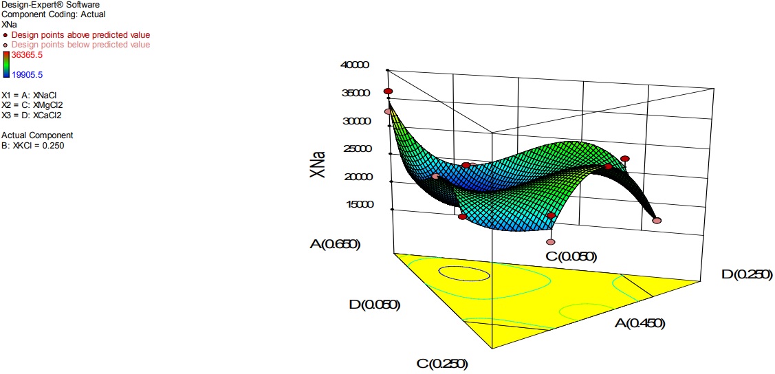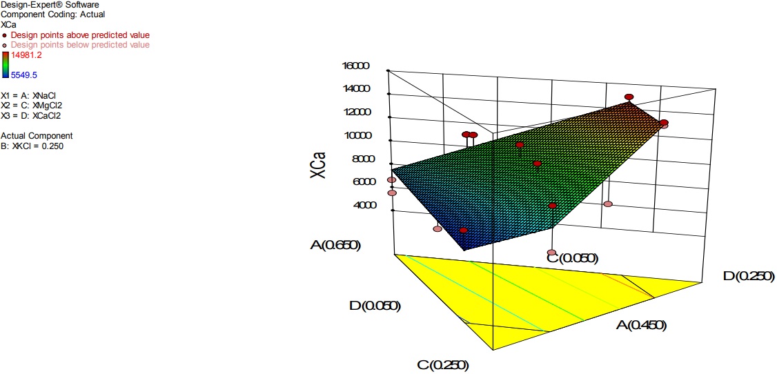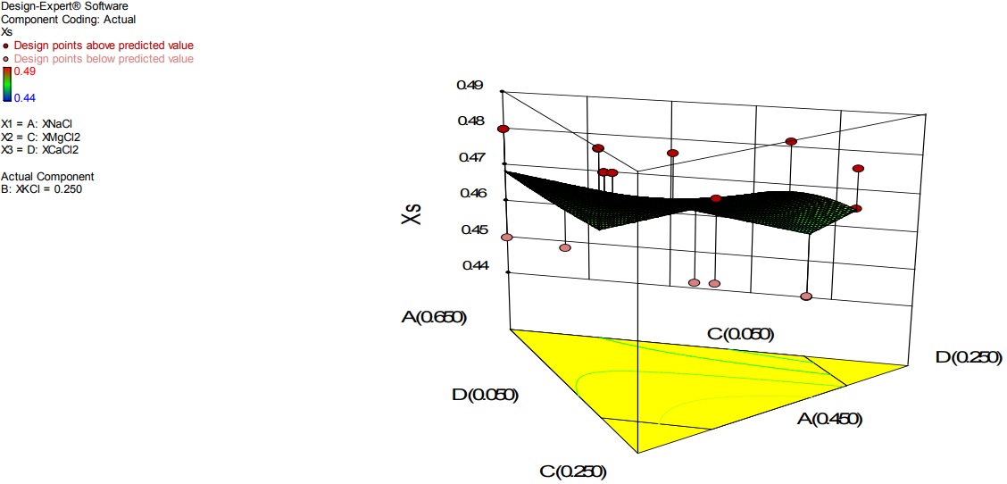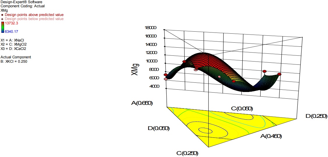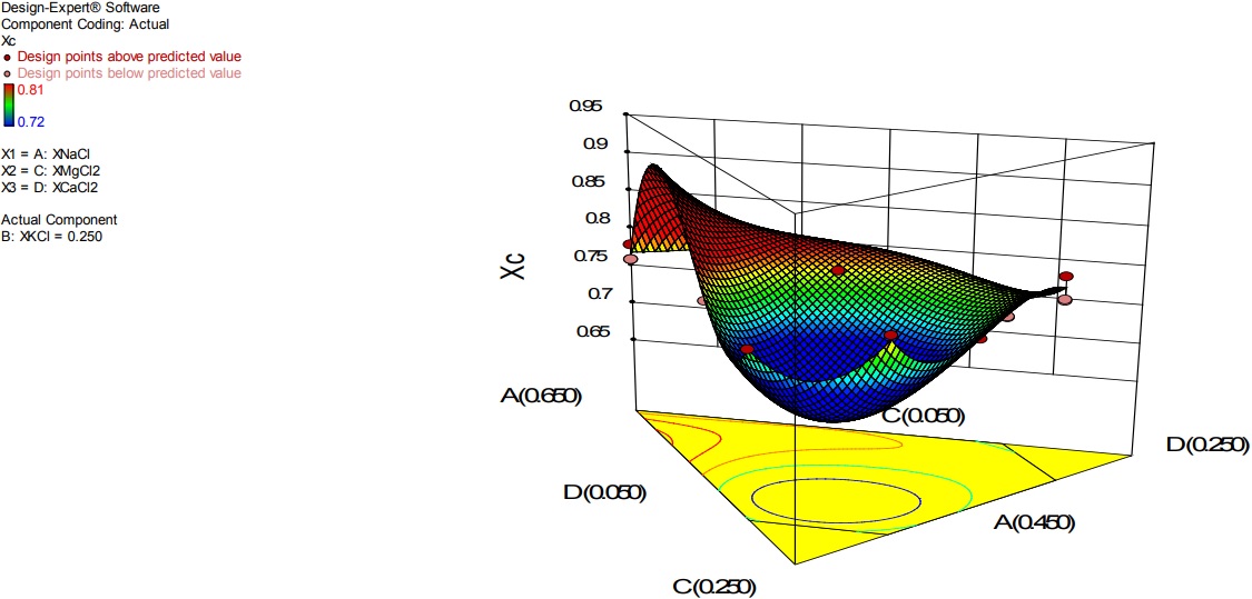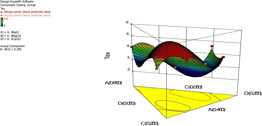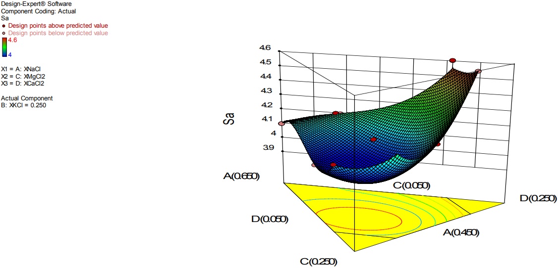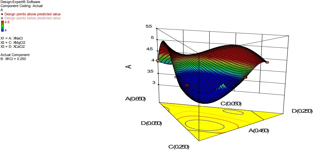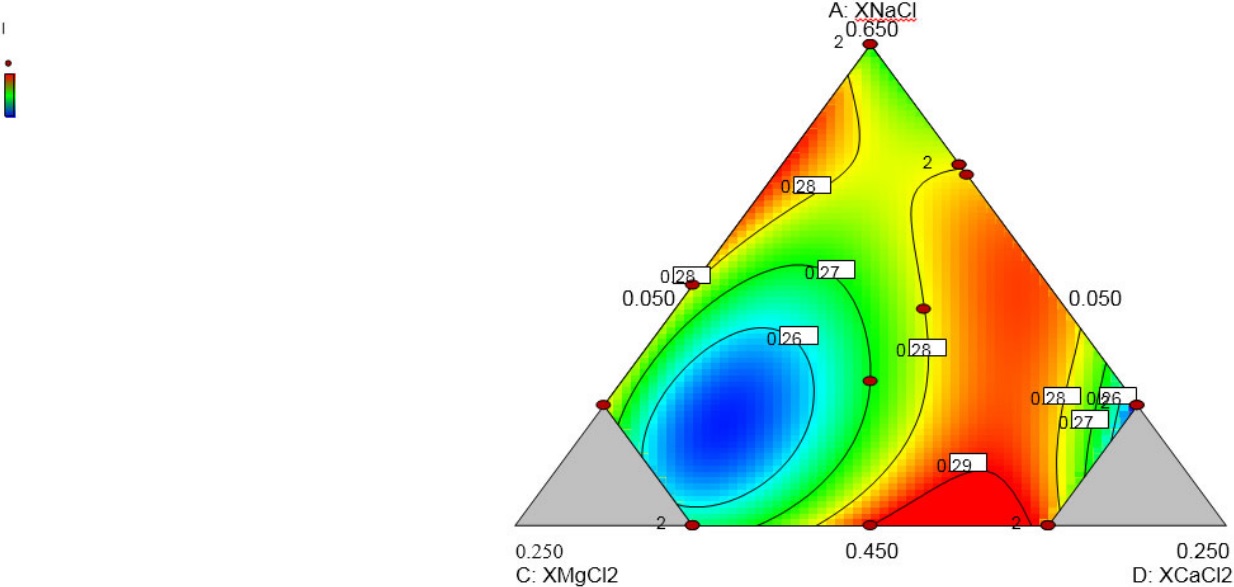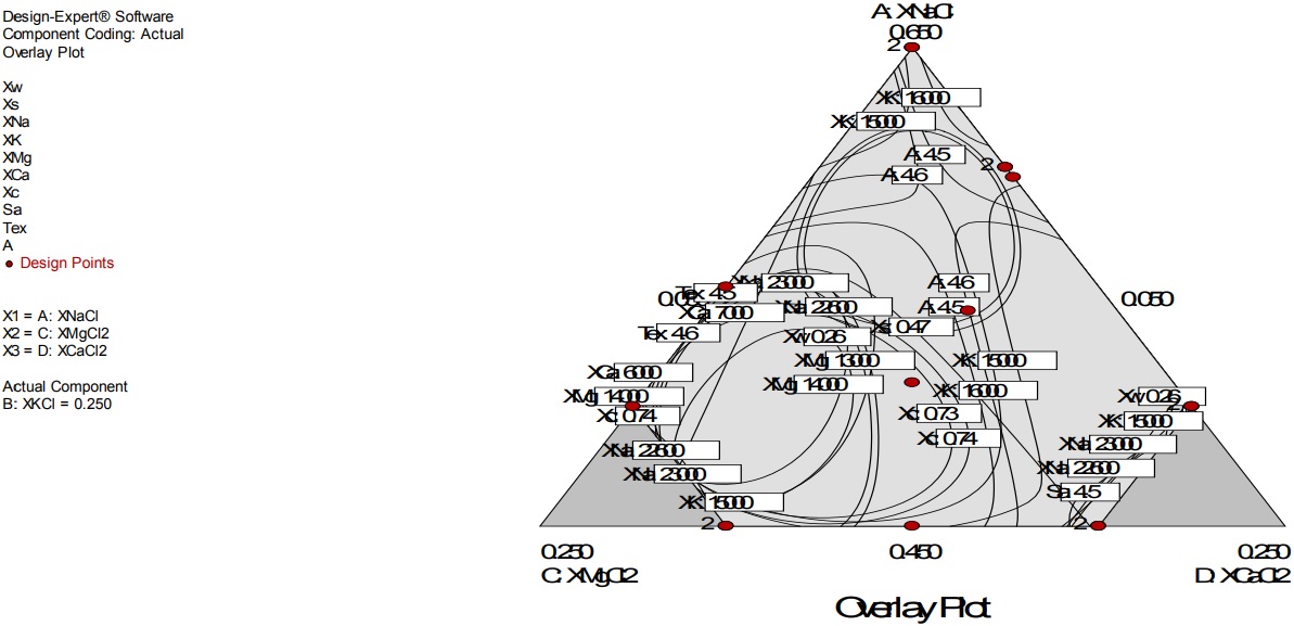 Para la optimización de la composición de la mezcla de NaCl, KCl, MgCl2 y CaCl2 se emplearon los métodos de la función deseada: optimización numérica [16] y la optimización gráfica [25]. La optimización numérica consiste en estandarizar cada respuesta en una función deseada (dn) cuyo valor varía de 0 (fuera del rango deseado) a 1 (en el rango deseado). Para todas las funciones deseadas de las diferentes respuestas, se define una función total D (0 < D < 1,0) igual al promedio geométrico de las n funciones individuales deseadas. Un valor alto de D indica las mejores funciones del sistema, lo cual se considera como la solución óptima. Los valores óptimos se determinan a partir de los valores individuales de las funciones deseadas que maximizan D. El método de la optimización gráfica, consiste en sobreponer las representaciones en un mismo plano, de los contornos de las diferentes superficies de respuesta para obtener el punto o la zona óptima donde se cumplen las condiciones deseadas.
