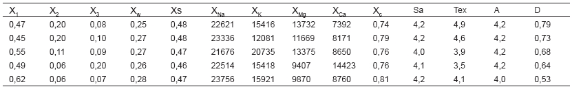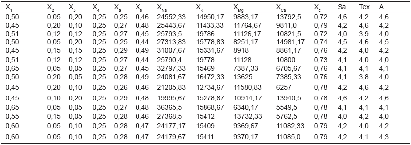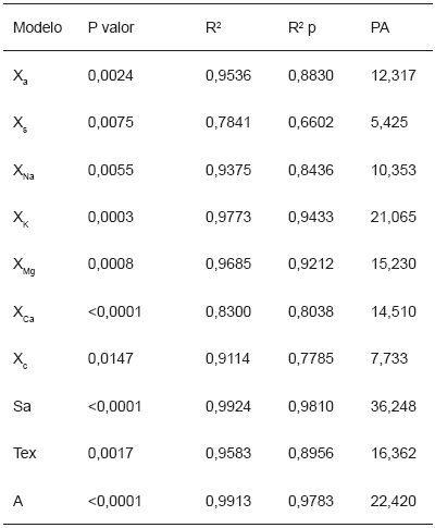 Los modelos ajustados para Xw, Xs, XNa, XK, XCa, XMg, Xc, Sa, Tex y A, explicaron el 95,36; 78,41; 93,75; 97,73; 96,85; 83,00; 91,14; 99,24; 95,83 y 99,13% de la variabilidad en estas variables, con una probabilidad mayor del 95% (TABLA II). El análisis estadístico de la adecuación de los modelos mostró que, los valores del R2 de predicción son comparables con los del R2 del ajuste y los PA son mayores de 4, indicando así que, las ecuaciones son adecuadas para calcular los cambios ocurridos y se pueden utilizar para predecir los valores de las variables respuestas estudiadas dentro del rango de los valores de los componentes de la mezcla.
