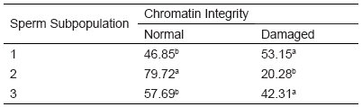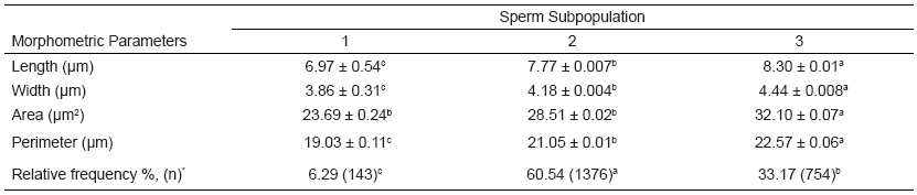 A total of 2,273 sperm head stained with toluidine blue were evaluated simultaneously to morphometry with CASMA system (SCA®) and chromatin integrity, 70.35% of sperm were with normal chromatin and 29.65% with damaged chromatin. After cluster analysis, according to morphometric parameters (length, width, area and perimeter) three morphometric distinct subpopulations were identified. Head dimensions to each subpopulation are summarized in TABLE I. The subpopulation 1 (SP1) was composed by the 6.29% of sperm and this included the smallest sperm head dimensions. Subpopulation 2 (SP2) characterized by spermatozoa with intermediate sperm head dimensions was integrated by the 60.54% of sperm; while subpopulation 3 (SP3) corresponding to the biggest sperm head was represented by the 33.17% of sperm.