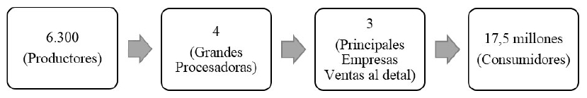 El mercado lácteo chileno se divide en aproximadamente 6.300 productores, once (11) procesadoras de lácteos, tres (3) grandes empresas de ventas al detal y 17,5 millones de consumidores aproximadamente [3, 14]. Estos antecedentes muestran una estructura del mercado oligopsónica en la recepción de leche (FIG. 1), donde cuatro (4) procesadoras de lácteos Colún (26,9%), Soprole (24,7%), Nestlé (18,6%) y Watt's S.A. (12,5%), controlan más del 82% de la recepción de leche fluida. Las otras procesadoras son Surlat (6,2%), Valle Verde (3,5%), Lácteos del Sur (2,6%), Danone Chile S.A. (2,3%), Quillayes (1,1%), Chilolac (1,1%) y Granarolo (0,6%).