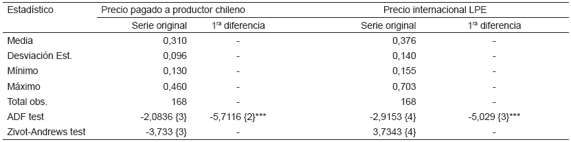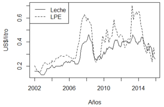 La evolución de las series de precios se muestra en la FIG. 2, destacándose una tendencia positiva desde el año 2002 al año 2014, junto a una fuerte fluctuación en el año 2007. Además, la figura muestra que, en el periodo de estudio, el precio internacional de la leche entera en polvo (LPE) equivalente en litro (L), es superior al precio pagado por L a productor chileno, destacándose la gran diferencia que existe alrededor del año 2014. Luego de esta fecha, ambos precios presentan una tendencia a la baja.