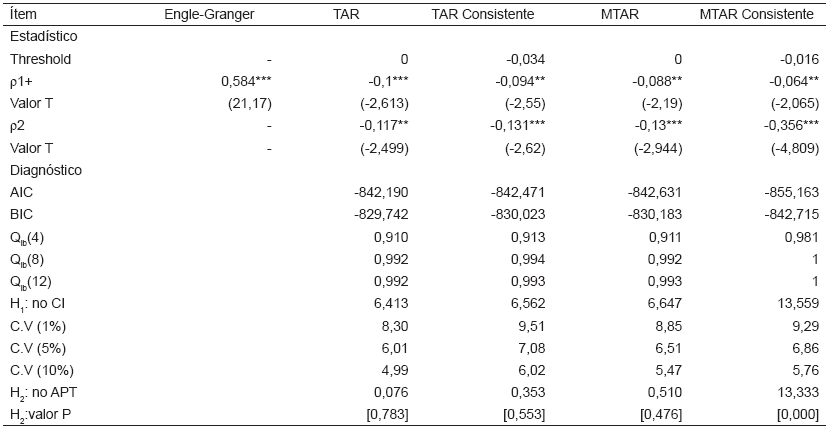 El análisis de cointegración no lineal por umbrales, se realizó con los modelos TAR, MTAR y sus respectivos consistentes como muestra la TABLA II. El mejor modelo estimado es el MTAR Consistente, al tener un menor valor para los criterios AIC y BIC.