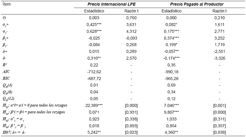 Dado los resultados anteriores, se estimó el Modelo de Corrección de Error Asimétrico, a partir del modelo MTAR Consistente, considerando la relación en ambos sentidos. Estos resultados son presentados en la TABLA III, donde para el modelo que explica los ajustes en el corto plazo para el precio pagado al productor chileno, se observa que casi todos los coeficientes alfas (α) relacionados a la variación positiva o negativa del precio internacional en el periodo anterior, y betas (β) relacionados con la variación positiva o negativa en el precio pagado al productor chileno en el periodo anterior, son significativos al 5%, a excepción de α1+ que fue significativo al 10%,. Mientras que los coeficientes del MCE para el modelo de precio internacional LPE resultaron significativos solamente los valores alfa (α), quiere decir que el precio internacional de la leche está explicado por sus propios valores en rezago y no por el precio chileno, resultado que afirma el nulo efecto de los precios chilenos al mercado internacional. Lo anterior se confirma con los resultados obtenidos en el test de Causalidad de Granger (H01 y H02).