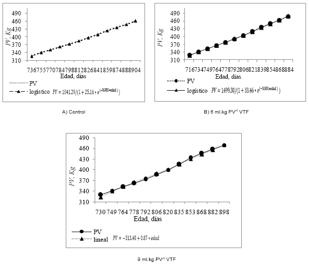 La evaluación del crecimiento PV por edad, según los criterios utilizados, permitió seleccionar los modelos que tuvieron el mejor ajuste en cada tratamiento. En el tratamiento control y el nivel de 6 mL.kg PV-1 VTF se ajustó el modelo logístico. En cambio, en el tratamiento con el nivel de 9 mL.kg PV-1 VTF se ajustó el modelo lineal. La totalidad de los tratamientos logran altos valores de regresión (R2=0,99). Los parámetros del modelo y de las curvas fueron significativos y los valores del estadístico Durbin Watson (DW) [7] fueron superiores a 1,4 lo que indica que no hubo problemas de auto correlación en los residuos.