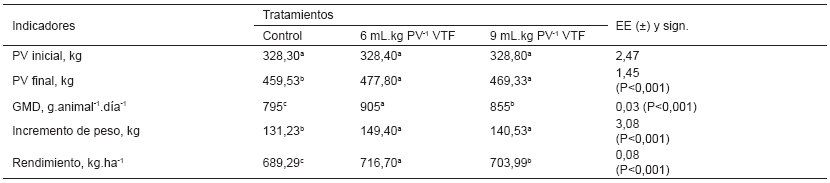 La TABLA I muestra el comportamiento productivo por tratamiento para los indicadores de PV, GMD, IP y el rendimiento por ha. En el PV inicial no se observó diferencias entre tratamientos. Sin embargo, para en el PV final los tratamientos con inclusión del VTF como aditivo microbiano, difirieron (P<0,001) del tratamiento control. Por su parte, los tratamientos con VTF también difirieron (P<0,001) con respecto al control, referente a la GMD y el IP, a la vez que difieren (P<0,001) entre ellos para la GMD. Además, se apreció que el tratamiento donde se adicionó el VTF, a razón de 6 mL.kg PV-1, los animales presentaron una mayor respuesta de GMD, con valores superiores a los 900 g.animal-1.d-1.