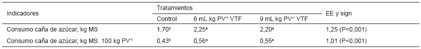 El incremento en el consumo de caña de azúcar y mayor respuesta de GMD, pudo estar asociado con la inclusión en la ración del VTF. Según Gutiérrez [16], Rodrigues y col. [32], Rodríguez y col. [33] y Elías [10], el suministro del VTF en rumiantes, promueve la fermentación ruminal y la digestibilidad de la MS en correspondencia con el crecimiento de las poblaciones de bacterias celulolíticas, entre otros aspectos.