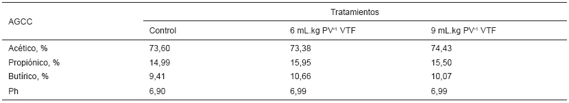 En esta investigación, no se determinaron las poblaciones de bacterias celulolíticas, pero durante todo el estudio se encontró una estabilidad de pH muy cercano a la neutralidad para los tratamientos con VTF, lo que infiere un ambiente favorable para el crecimiento de las poblaciones de bacterias celulolíticas. En ese sentido, en los tratamientos donde se suministró VTF se debió estimular un mayor consumo de MS total, en relación con una mayor respuesta productiva. Asimismo, los valores porcentuales de AGCC (acético, propiónico y butírico) en la totalidad de los tratamientos (TABLA III) se encuentran en correspondencia con el tipo de alimento utilizado, básicamente fibroso, con predominio de acetato como producto final de la fermentación ruminal [9, 30, 38]. De manera que el suministro de VTF no afectó la proporción molar encontrada, la cual estuvo dentro del rango descrito por Austgen y Bowen [2] de 60-75; 15-19 y 8-16%, para el ácido acético, propiónico y butírico, respectivamente.