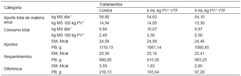 Resultados obtenidos por Gutiérrez y col. [17] con cabras lecheras (Capra hircus) en semiestabulación, alimentadas con forraje de baja calidad y VTF como aditivo microbiano en estado líquido, observaron incrementos en el consumo de MS y fibra en detergente neutro (FDN). Además, mejoró las condiciones de fermentación ruminal y aumentó la producción y calidad de la leche. En correspondencia con la utilización de este producto, se desarrolló una investigación con el objetivo de evaluar el efecto de incluir el producto biológico VTF en estado líquido, en el comportamiento productivo de toros Cebú mestizos finalizados durante el periodo lluvioso en SSP con leucaena, complementados con caña de azúcar.