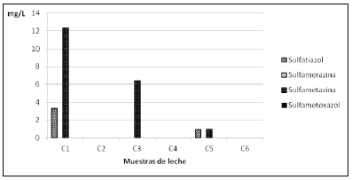 Las concentraciones de residuos de antimicrobianos presentes en las muestras de leche completa de larga duración analizadas (TABLA I), corresponden a las muestras C1 y C5, resultaron positivas a la detección de sulfatiazol y sulfametazina y C3 resultó positiva a sulfametazina, indicando que tres (50%) de las seis muestras de leche completa de larga duración que fueron analizadas, resultaron positivas a la detección de sulfamidas. Como puede observarse, las concentraciones de sulfamidas obtenidas en la investigación, fueron superiores a los LMRs de sulfamidas en leche, recomendados por el Codex Alimentarius [11].