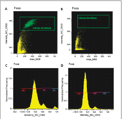 Como se puede observar en la FIG. 1, tanto las muestras con altos CCS (FIG. 1A y 1C) como las de bajos CCS (FIG. 1B y 1D) presentan una población de RC, que pueden influir en el resultado de CMT, debido a que su positividad depende de la cantidad de ADN que interactúa con el bromocresol de base violeta presente en el reactivo del kit diagnostico [14, 19]. Sin embargo, CCS mediante la CFI permite discriminar el ADN que se encuentra en el interior de las células del ADN proveniente de los RC con gran facilidad (FIG. 1). Estos RC presentan cierta cantidad de ADN en su interior que puede reaccionar con el reactivo del CMT, haciendo que el CMT sea difícil de interpretar y presente baja sensibilidad [28].