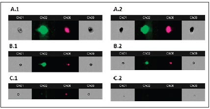 IMÁGENES OBTENIDAS MEDIANTE LA CITOMETRÍA DE FLUJO POR IMÁGENES DE LAS MUESTRAS DE LECHE, Ch01 y Ch09: Imagen obtenida con luz natural, Ch02: Imagen obtenida con la flourescencia del Sybr Green, Ch06: Imagen obtenida con el láser de campo oscuro (785 nm); A.1 y A.2. Células somáticas; B.1 y B.2. Restos celulares; C.1 y C.2. Objetos no celulares.