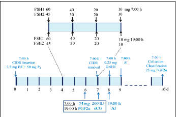 A superovulation protocol at fixed time (FIG. 1) was used. Ond zero each donor received a progesterone-releasing intravaginaldevice (CIDR-B®, 1.9 g Dec. Manufacturing, Hamilton, NewZealand) and additionally 2.5 mg of estradiol benzoate (BE,Estrol, Loeffler, Institute Agrobioquímico SA de CV, Mexico) and50 mg of Progesterone (P4, Lapisa, SA de CV for Zoetis Mexico Sde RL de CV, Mexico) were injected intramuscularly. Decreasingdoses of FSH were administered daily from d four to seven inthe morning and afternoon (Folltropin-V, NIH-FSH-P1, BionicheAnimal Health Inc., Belleville, Ontario, Canada) which completedtotal levels of 260 (FSH1, n = 13) and 210 (FSH2, n = 12) mg,corresponding to the two treatments, each assigned randomlyto females. Intramuscular doses of 25 mg of ProstaglandinF2α (PGF2α; Lutalyse, Dinoprost-tromethamine, Pharmacia &Upjohn, Inc., Michigan, USA) were applied on d six in the morningand afternoon. The CIDR was removed 24 h after the PGF2αwas applied and every donor received intramuscular doses of200 UI of equine Chorionic Gonadotropin (eCG; Folligon, IntervetInternational, BV Boxmeer, Netherlands) in the morning andafternoon. On d eight, during the morning, 24 h after removingthe CIDR, an intramuscular dose of 0.25 mg of GonadotropinreleasingHormone (GnRH; Gonadorelin Fertagyl, Intervet International, Germany) was applied. The first AI was performedat 36 h of removing the CIDR and the second 12 h later, using twostraws each time.