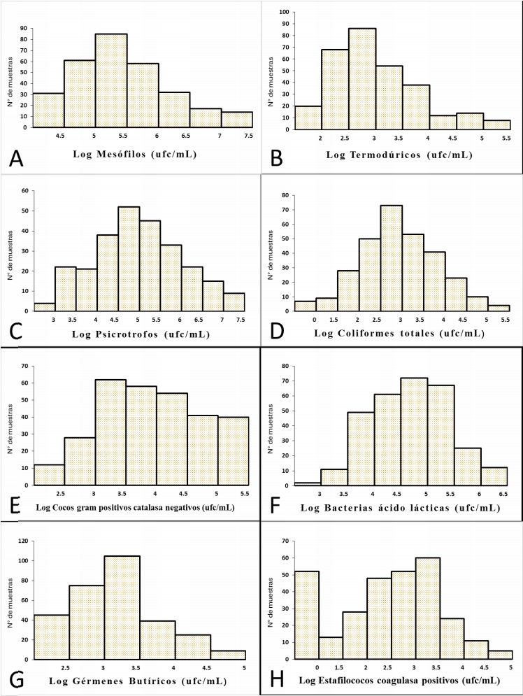 Los recuentos de bacterias lácticas (BAL) obtenidos en leche de oveja en tanque en este estudio fueron de 4,90 log ufc/mL, superiores a los de otros estudios en ovino lechero [3, 31]. La distribución de frecuencias para el recuento de las BAL se recoge en la (FIG. 1F). El mayor porcentaje de muestras (83,28%) presentó unos recuentos entre 4 y 5,5 log ufc/mL. Este grupo de microorganismos es muy importante desde el punto de vista de la tecnología quesera, siendo esenciales en los procesos de fermentación del queso, y en el desarrollo del aroma y sabor característico de éstos [33]. No obstante, convendría discriminar las BAL que poseen acciones beneficiosas, de aquellas que podrían generar efectos negativos, como por ejemplo la producción de aminas biógenas [39].
