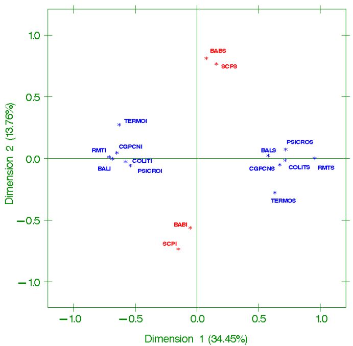 Para determinar la asociación entre diferentes niveles de microorganismos se ha realizado un análisis de correspondencias entre categorías de los recuentos anteriormente considerados. Para cada grupo se han establecido dos categorías según el valor del correspondiente P50 (I: inferior al P50; S: superior al P50), excepto para el RMT donde se ha utilizado el rango de 500.000 ufc/mL establecido en el Reglamento (CE) 853/2004 [6].