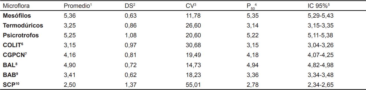 1Logaritmo de ufc/mL (esporas/mL en el caso de BAB); 2DS: Desviación estándar; 3CV: Coeficiente de variación; 4P50: Percentil 50; IC5: Intervalo de confianza al 95%; 6COLIT: coliformes totales; 7CGPCN: cocos gram positivos catalasa negativos; 8BAL: bacterias ácido lácticas; 9BAB: gérmenes butíricos; 10SCP: estafilococos coagulasa negativos.
