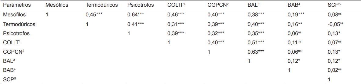1COLIT: coliformes totales; 2CGPCN: cocos Gram positivos catalasa negativos; 3BAL: bacterias ácido lácticas; 4BAB: gérmenes butíricos; 5SCP: estafilococos coagulasa negativos; ***P < 0,001; ** P < 0,0; * P < 0,05; ns P > 0,05.