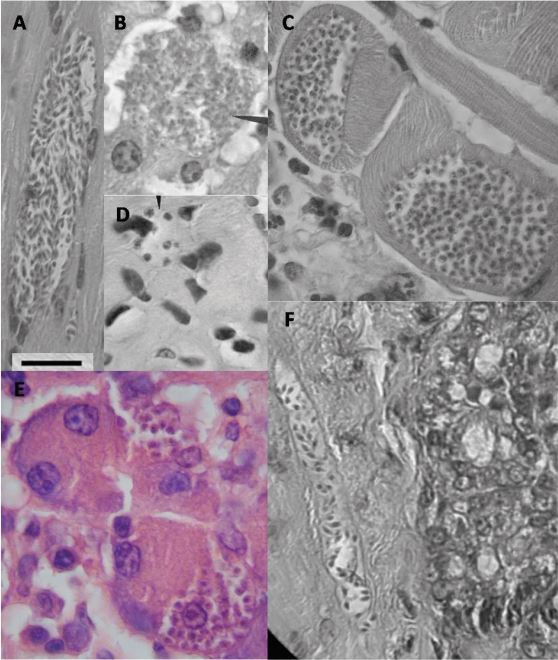 Se destaca el parasitismo intracelular importante y poco señalado [46] en el globo ocular (estroma corneal), cerebro, hueso (médula de fémur), pulmón, glándula suprarrenal, páncreas e hígado. Las restantes biopsias presentaron parasitismo escaso o ausente. Estos resultados muestran las marcadas diferencias del tropismo que causaron los aislados de T. cruzi en su invasión sistémica que afectó células de origen meso-endo- y ectodémico.