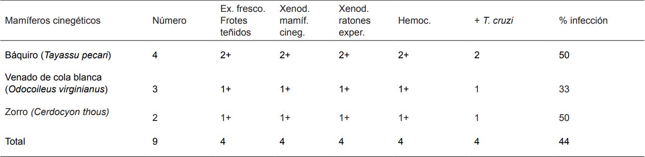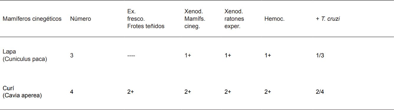 Ex.Fresco= Examenes de sangre en fresco; Frotis teñidos de sangre; Xenod. mamíf. cineg.= Xenodiagnósticos aplicados a los mamíferos cinegéticos; Xenod. ratones exper.= Xenodiagnósticos aplicados a los ratones experimentales; Hemoc.= Hemocultivos; +T. cruzi= Positivos; % infección= porcentaje de infección.