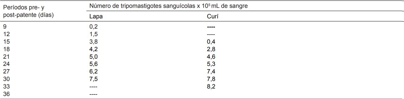 Tres de los siete mamíferos estudiados (TABLA III) mostraron resultados similares a los presentados por los mamíferos de talla mayor y por los ratones experimentales al presentar: los morfotipos ya señalados; el polimorfismo desarrollado en los triatominos utilizados en los xenodiagnósticos y los hemocultivos; prepatencias y patencias y sus valores más elevados (TABLA IV) y 100% de mortalidad en el modelo murino, evidenciando así la misma heterogeneidad entre los parámetros estudiados.