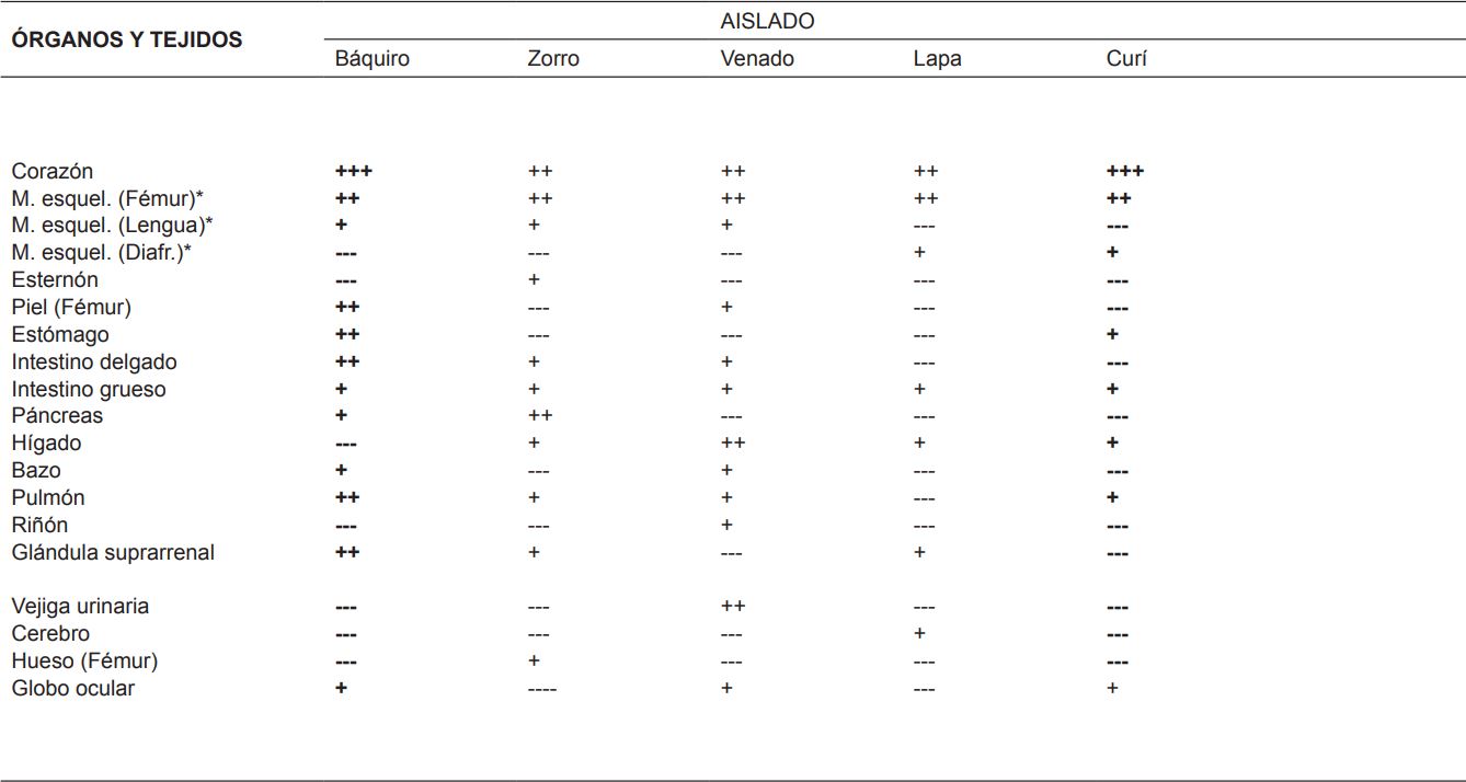 Los resultados histoparasitológicos (TABLA V) determinados en los ratones experimentalmente infectados con aislados de las cinco especies cinegéticas estudiadas mostraron que todos los 19 tejidos y órganos examinados fueron invadidos por T. cruzi presentando seudoquistes intracelulares con estadios amastigotes. Los aislados de báquiro y curí produjeron un parasitismo abundante marcadamente cardiotropo. Tropismo moderado fue producido por varios aislados en miocitos de tejido esquelético y piel de fémur así como en la musculatura lisa de estómago e intestino delgado.