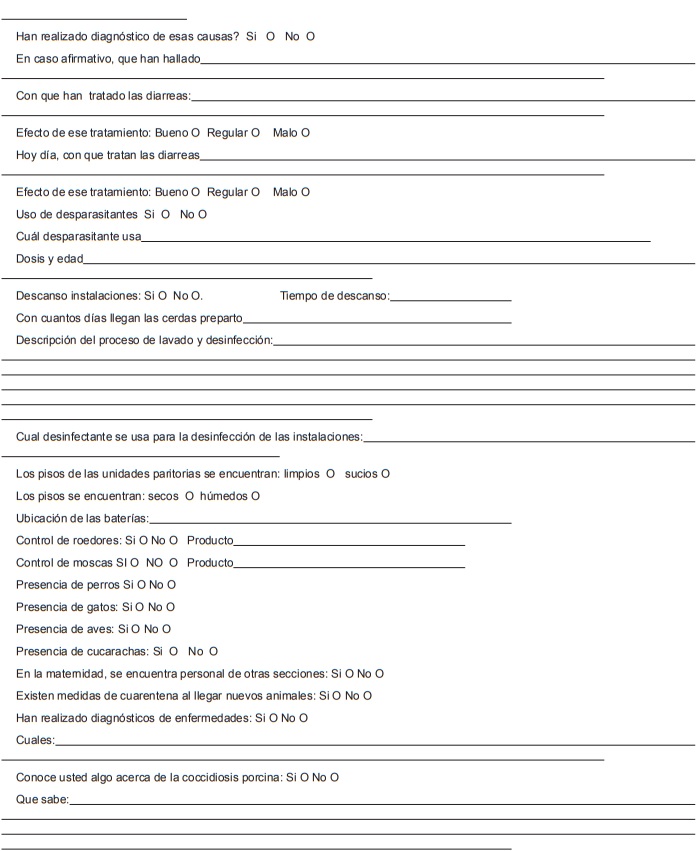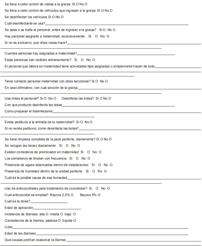 Con respecto a la asistencia veterinaria, se categorizó en ausente (1) y presente (2). Los protocolos de limpieza de las jaulas paritorias se clasificaron en tres tipos: lavado o remojado con agua de chorro (1), lavado con agua de chorro más desinfección con solución de glutaraldehído al 5%, empleando una bomba de espalda (marca Jacto, modelo PJH de 20 L, Brasil) (2), y lavado con agua de chorro más empleo de bomba de hidrojet (marca Truper, modelo Boap, China) (expulsión de agua a 70°C y presión de 3.300 lbs/pulg2) más desinfección con solución de glutaraldehído al 5% (3). Con relación al uso de anticoccidiales por vía oral como tratamiento preventivo, se clasificaron en: no emplea (1), emplea 2 mL / lechón de Baycox al 2,5% (2) y emplea 1 mL / lechón de Baycox al 5% (3). Los datos meteorológicos (temperaturas, humedad relativa y precipitaciones) fueron tomados de los registros del anuario de la estación Meteorológica El Pao – Valencia, estado Carabobo, Venezuela [3]. La estación se encuentra en Latitud: 10,16; Longitud: - 67,93; Altitud: 430 m.