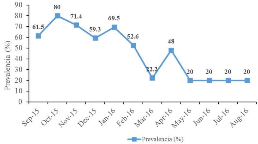Los resultados obtenidos se analizaron mediante estadísticos descriptivos y test de Ji-cuadrado para determinar asociaciones estadísticas entre prevalencia y mes de muestreo. Se utilizó el coeficiente de correlación de Pearson para determinar correlaciones entre prevalencia y constantes meteorológicas. Para los cálculos se utilizó el programa estadístico Statistix [27].