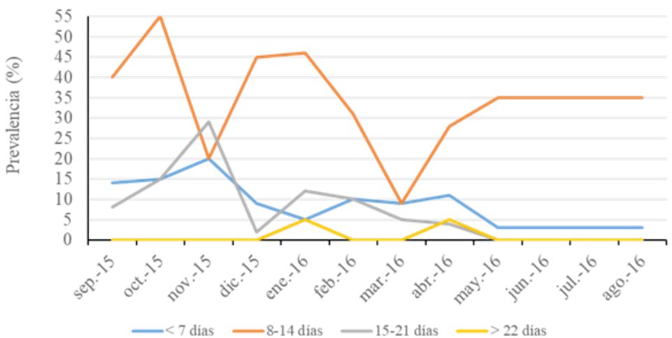 En la FIG. 2 se muestra la curva de la dinámica de prevalencia por grupo de edad durante el período estudiado. Los resultados obtenidos se analizaron mediante un test de asociación (Ji – cuadrado de Pearson), donde se encontró asociación estadística (X2: 18,56; P < 0,05) entre la prevalencia de C. suis con respecto al grupo de lechones. El grupo 2 (8 a 14 d) mostró los mayores valores de prevalencia durante todo el período estudiado. El valor más alto se registró en octubre (55%), y el más bajo en marzo (9,1%), mientras que el grupo 4 (camadas > 22 d) resultó ser el menos prevalente a C. suis. Los grupos 1 y 3 mostraron diversos valores de prevalencia durante todo el estudio, sin embargo, los grupos 3 y 4 no mostraron excreción de ooquistes en los últimos cuatro meses del estudio. Los resultados obtenidos coinciden con lo señalado por otros autores, quienes determinaron mayores valores de prevalencia en las dos primeras semanas de vida y podría deberse a la falta de un adecuado programa de profilaxis y control en la granja, lo que trae consigo mayor presión de infección en esta edad [9, 24], sin embargo, en otros estudios se determinaron mayores tasas de prevalencia en camadas de 3 y 4 semanas de vida [2, 18, 20]. Dado que los lechones nacen con un sistema inmune inmaduro, la transferencia calostral de anticuerpos y células inmunes parece ser un factor esencial para controlar las infecciones a esa edad. Sin embargo, aún no se entiende el papel de los anticuerpos específicos contra C. suis transferidos de las madres a los lechones y las posibles correlaciones entre los niveles de anticuerpos y la Cystoisosporosis [25]. Schwarz y col. [26] demostraron la presencia de anticuerpos en el calostro y la leche de cerdas infectadas experimentalmente antes del parto, ya que el efecto protector estuvo altamente correlacionado con los títulos de anticuerpos durante las primeras 2 semanas de vida, lo que explicaría la baja prevalencia de C. suis en lechones con menos de una semana de edad.