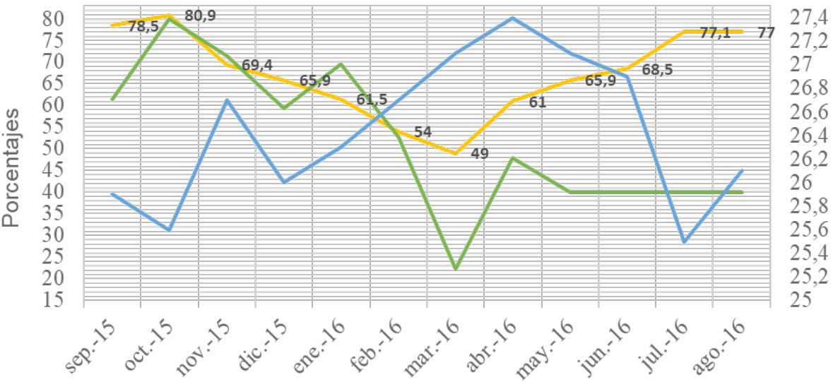 En la FIG. 3 se muestra la curva de correlación entre los valores de temperatura, humedad y prevalencia durante los doce meses de estudio. La temperatura media anual fue de 26,3°C, con lecturas muy bajas (20,2°C) en el mes de diciembre, mientras que la lectura más alta se registró en abril (34,2°C). Con respecto a la humedad relativa, se registró una media anual de 68,2%, siendo el mes de marzo el que menor porcentaje de humedad mostró (55,8%), mientras que septiembre y octubre mostraron los mayores porcentajes de humedad. En relación a las precipitaciones, se registró 551,9 mm de agua, en promedio, siendo los meses de noviembre y diciembre los de menor precipitación, mientras que enero a julio comprendió el período de mayor precipitación. Según los resultados obtenidos la prevalencia disminuyen en los meses con menor humedad relativa, sin embargo, la curva de temperatura es inversamente proporcional a los valores de prevalencia. Se podría inferir que a mayor precipitación y humedad, mayor sería la presencia del protozoario, sin embargo, los resultados no reflejan esto, ya que en los meses de menor precipitación (primeros cuatro meses del estudio) hubo mayor presencia de C. suis, lo que podría indicar que factores tales como, ausencia de veterinario y falta de buen programa de lavado y desinfección, estarían involucrados en el comportamiento del parásito. En Venezuela no existen altas variaciones climatológicas como en otras regiones del mundo, donde existen fluctuaciones estacionales muy marcadas que afectan en el país la dinámica parasitaria, sin embargo, no cabe duda que las constantes meteorológicas registradas son óptimas para que ocurra el proceso de esporulación, y por tanto, mantener viables ooquistes de C. suis durante todo el año, y especialmente hasta la llegada de nuevos hospedadores, quienes se encargarán de multiplicar y perpetuar el parásito dentro de la explotación, sobre todo cuando se encuentren vulnerables los mecanismos de bioseguridad.